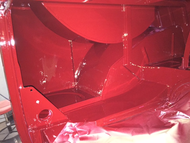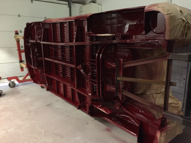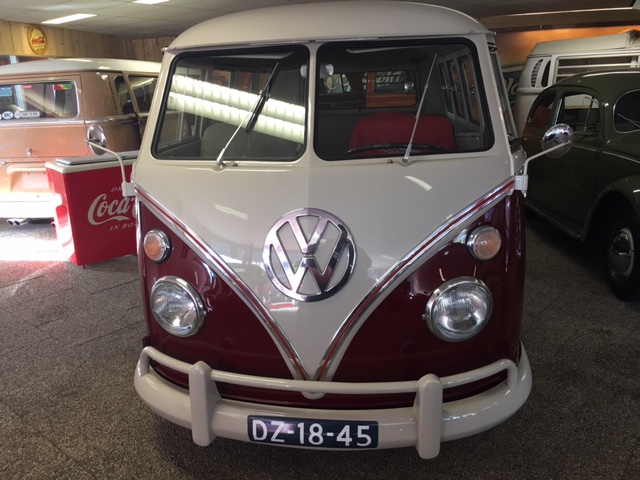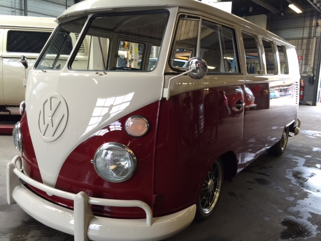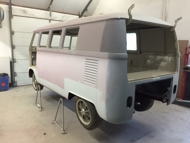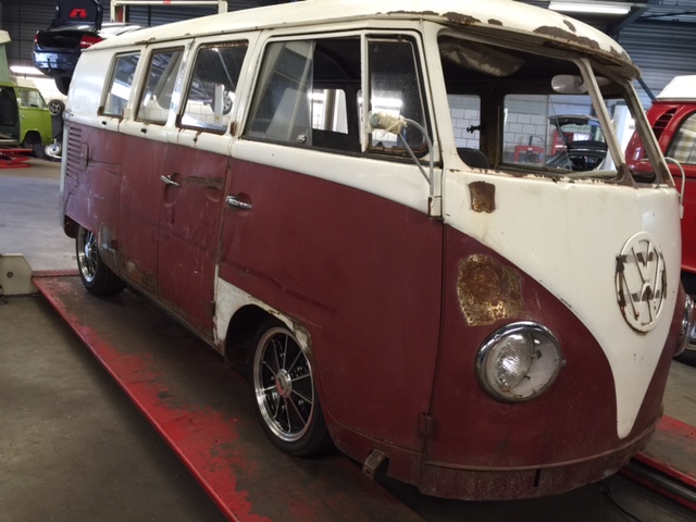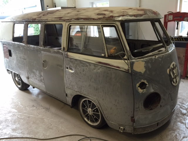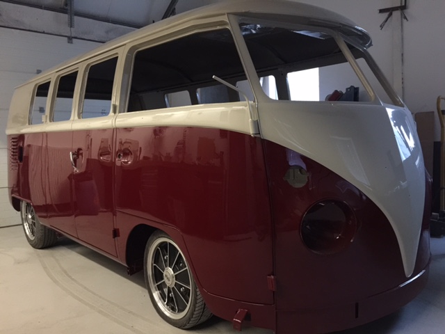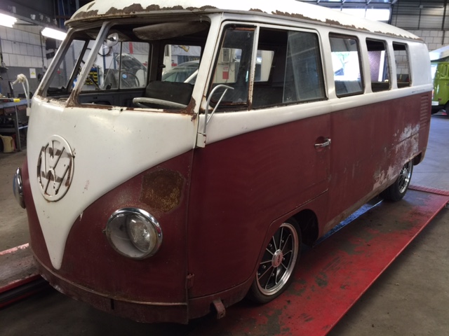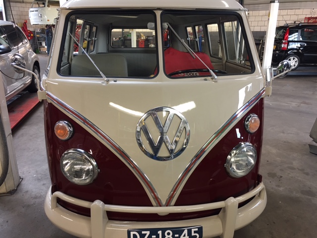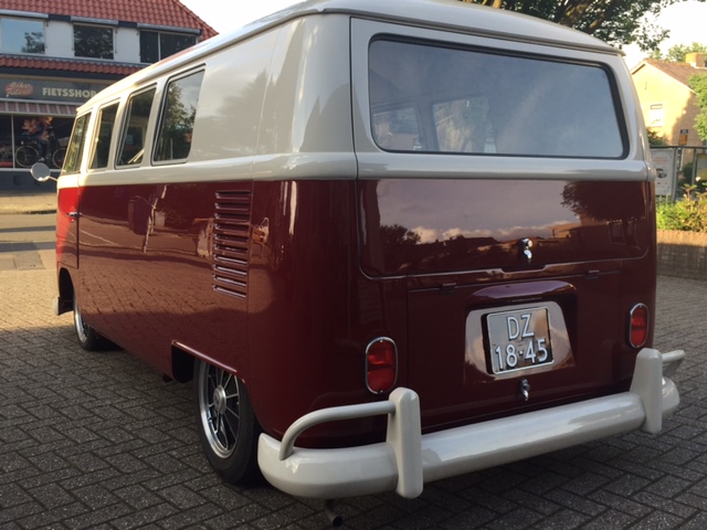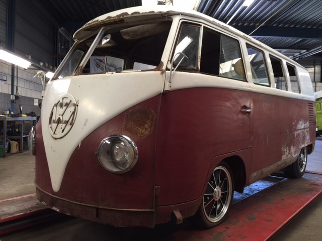 Toen ik de bus kocht was t echt zielig hoe die er bij stond, een achterklep in een groene kleur die zijn oude baasje erbij gezocht had om hem toch compleet te maken. Maar met zijn snufferd laag aan de grond en zijn glimmende wielen was het echt een coole dikke bus. We zijn er mee gestart en de bus compleet kaal gemaakt en begonnen met divers plaatwerk te vernieuwen om de bus weer compleet recht op zijn pootjes te zetten. Wat zullen we doen; overlegde John en ik zo laten of terug in de originele staat? Voor dat laatste is gekozen originele vooras en normale hoogte. De klant die de bus heeft gekocht wilde er nog een mooie samba trim op en deze hebben we uiteraard keurig gemonteerd in onze eigen werkplaats. Daar ging die dan daaaag dikke rooie…..